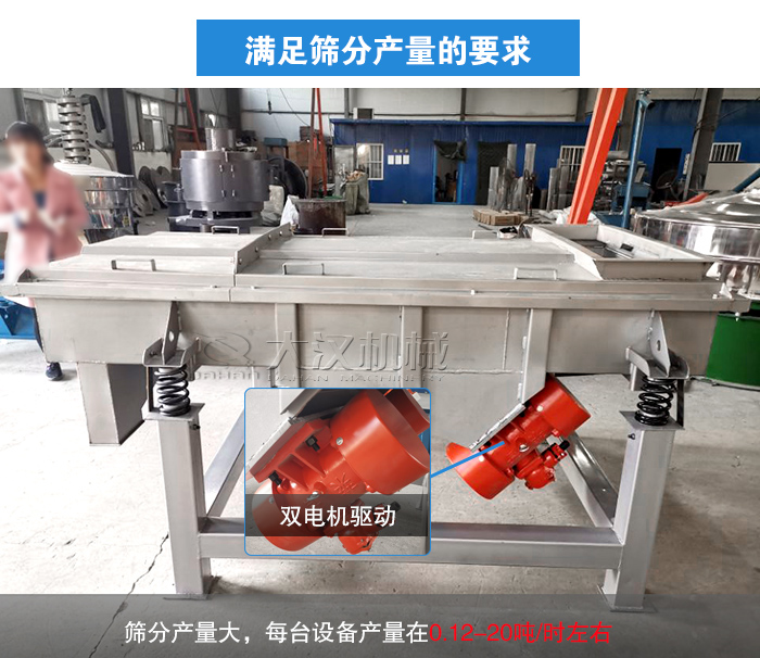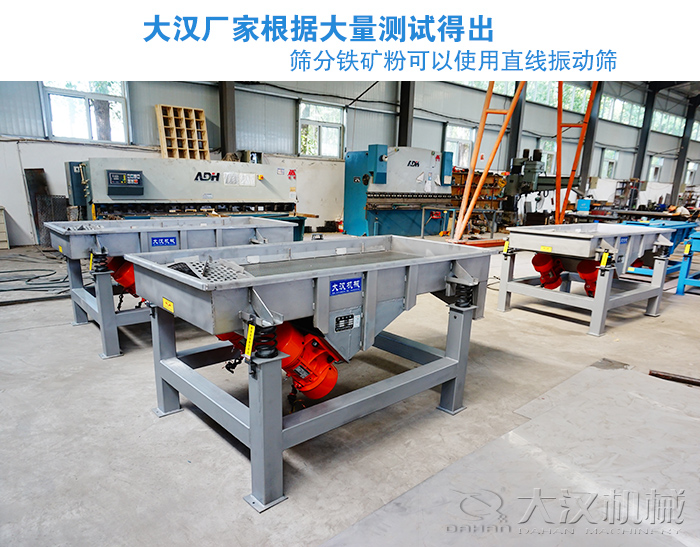篩分鐵礦粉就用直線振動篩,大漢直線振動篩廠家直銷,價格便宜,質(zhì)量獲得ISO和CE認證,使用更長久,如果您對我們的產(chǎn)品感興趣可以隨時咨詢。