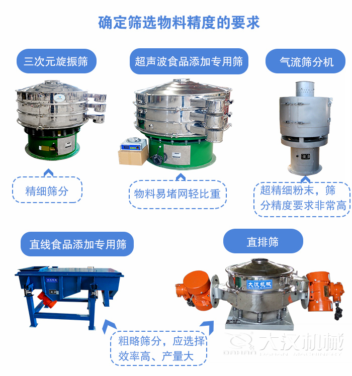 了解自己的物料對(duì)篩分精度的要求,是精細(xì)篩分?還是粗略篩分?如果是精細(xì)篩分,通常應(yīng)在三次元旋振篩、超聲波食品添加專用篩兩種機(jī)型中選擇。這兩種機(jī)型中,如您的物料具有強(qiáng)吸附性、易團(tuán)聚、高靜電、高精細(xì)、高密度、輕比重等特點(diǎn),可選用超聲波食品添加專用篩。如果您的物料是碳酸鈣、輕鈣、活性鈣、鋅粉、木粉、中藥粉、碳黑、石墨、活性炭、橡膠助劑、云母粉等超精細(xì)粉末,篩分精度要求非常高,應(yīng)選擇氣流篩分機(jī)。如果是粗略篩分,應(yīng)選擇效率高、產(chǎn)量大的直線食品添加專用篩或直排篩,如無特殊要求,通常選擇直線食品添加專用篩的比較多。