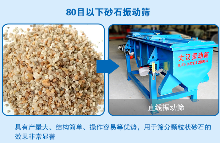 對(duì)于80目以下的砂石來(lái)說(shuō),外形為顆粒狀,建議使用直線振動(dòng)篩。這種篩機(jī)具有產(chǎn)量大、結(jié)構(gòu)簡(jiǎn)單、操作容易等優(yōu)勢(shì),用于篩分顆粒狀砂石的效果非常顯著;