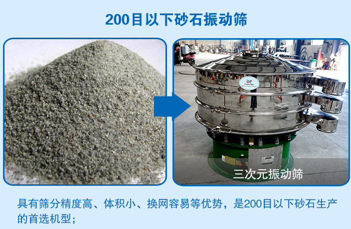 200目以下砂石呈現(xiàn)的就是粉末狀了,篩分過(guò)程中就需要考慮到粉塵污染、堵網(wǎng)問(wèn)題,所以小編建議使用三次元振動(dòng)篩來(lái)對(duì)其進(jìn)行篩分工作。該系列篩機(jī)具有篩分精度高、體積小、換網(wǎng)容易等優(yōu)勢(shì),是200目以下砂石生產(chǎn)的優(yōu)選機(jī)型;