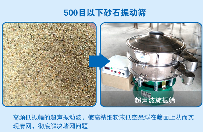 對(duì)于500目以下砂石粉末來(lái)說(shuō)已經(jīng)為高精細(xì)粉末物料,如使用普通篩機(jī)就會(huì)出現(xiàn)堵網(wǎng)問(wèn)題從而影響篩分精度與產(chǎn)量。對(duì)于該類型的砂石產(chǎn)品就需要使用到另一款篩分設(shè)備——超聲波旋振篩。該類型篩機(jī)的清網(wǎng)裝置使用的是超聲波系統(tǒng),開(kāi)啟后篩面會(huì)形成一個(gè)高頻低振幅的超聲振動(dòng)波,使高精細(xì)粉末低空懸浮在篩面上從而實(shí)現(xiàn)清網(wǎng),解決堵網(wǎng)問(wèn)題。