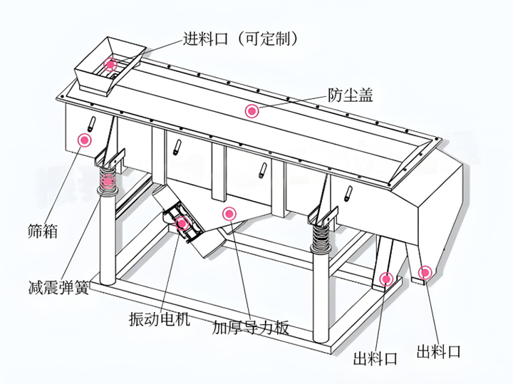 直線篩分機(jī)有分級篩選的功能,可配置 1-5 層篩網(wǎng),單層除雜,多層分級,層數(shù)越多,處理量就越大,耗材和做工成本也越高,價格也就越貴。比如在面粉加工中,通過細(xì)目篩網(wǎng)分離面粉與麩皮。除雜篩選功能是針對單一物料,去除其中的雜質(zhì)從而提升物料純度。比如在化工行業(yè)中,去除塑料顆粒中的金屬雜質(zhì)或結(jié)塊顆粒。還有脫水功能,在礦山、煤炭行業(yè),針對含水量較高的物料,如洗煤后的濕煤,通過 大孔徑篩網(wǎng)和高頻振動,分離物料中的游離水分或介質(zhì),降低物料含水率。
