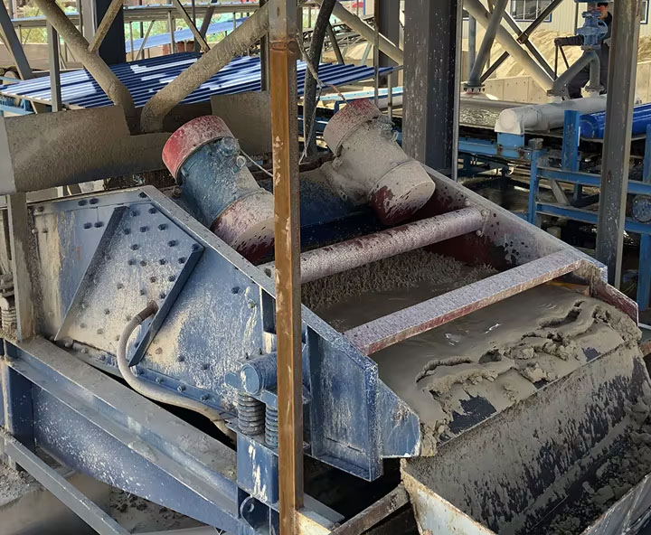 云南某玻璃制品企業(yè)石英砂生產(chǎn)線需要對水洗石英砂成品前進行脫水脫泥工序,面臨水洗后石英砂脫水不充分、含粉量過高的問題;需要將將石英砂含水率降至8%以下,去除粒徑0.1mm以下細粉雜質(zhì),保障成品砂純度;選用的是大漢的ZSM1556型高頻脫水振動篩,配120目聚氨酯防堵篩網(wǎng),處理量達25t/h,不僅高效完成脫水脫泥,解決了原石英砂含水率高導致的烘干能耗大、成品砂純度不達標問題,還因篩網(wǎng)抗堵塞設(shè)計減少了停機清理時間,提升了生產(chǎn)線連續(xù)運行效率,成品石英砂合格率從原先的85%提升至99%以上。
