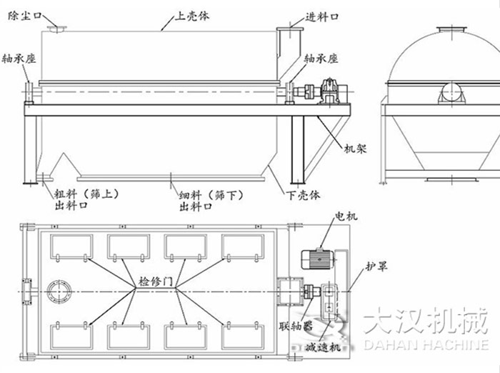 滾筒篩(滾筒篩分機)主要由電機、減速機、滾筒裝置、機架、密封蓋、進料口、出料口等部分組成。