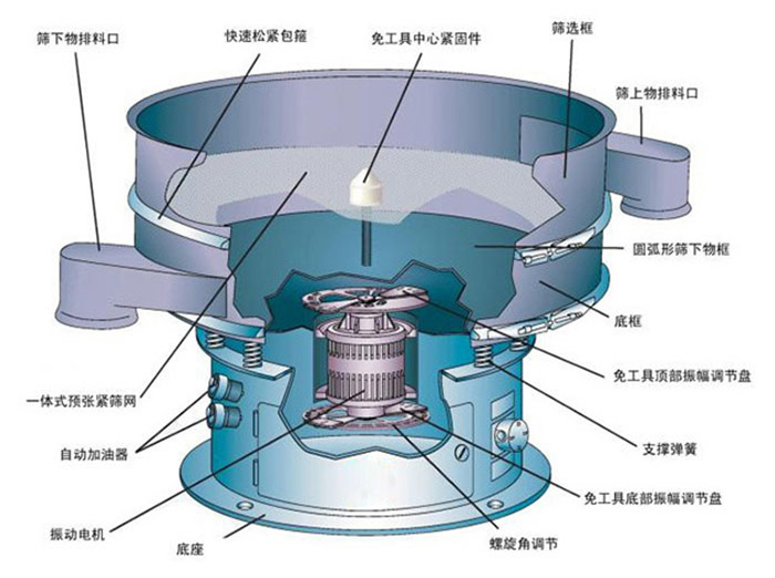 YBS搖擺篩主要由進料口、上蓋、觀察孔、篩框、密封圈、出料口、網(wǎng)架、束環(huán)、主樞軸總成、調(diào)整塊、彈簧、主軸總成、皮帶輪、底座、檢查孔、電機等部分組成。