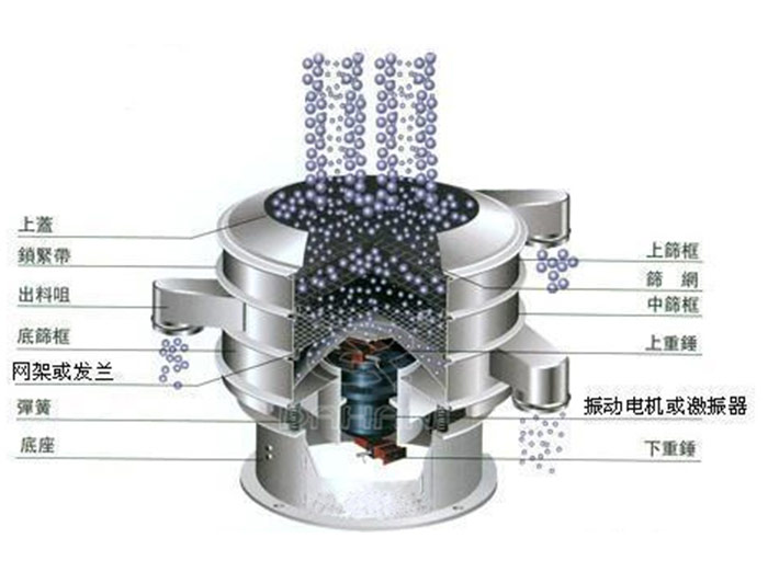 振動(dòng)篩主要是由主要由進(jìn)料口、防塵蓋、出料口、束環(huán)、篩網(wǎng)、配重塊、上部重錘、振動(dòng)體、振動(dòng)電機(jī)、彈簧、下部重錘、機(jī)座等部分組成。
