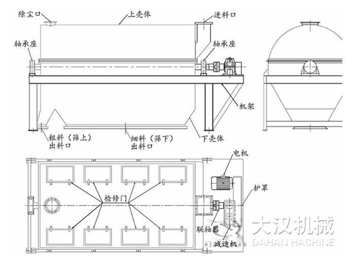 圓筒回轉(zhuǎn)篩主要是由動力組件、粗料出料口、上密封殼、篩筒、篩下物出料口、擋料板、進(jìn)料口、支架等部分組成的。