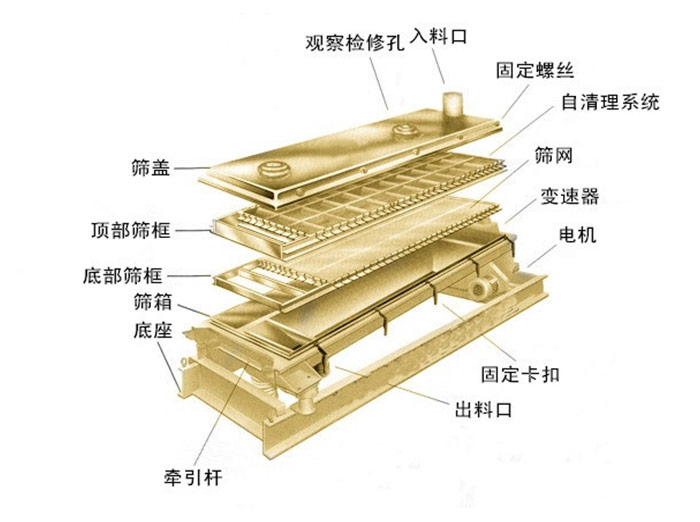 方形搖擺篩主要由進料口、上蓋、觀察孔、篩框、密封圈、出料口、網(wǎng)架、束環(huán)、主樞軸總成、調(diào)整塊、彈簧、主軸總成、皮帶輪、底座、檢查孔、電機等部分組成。