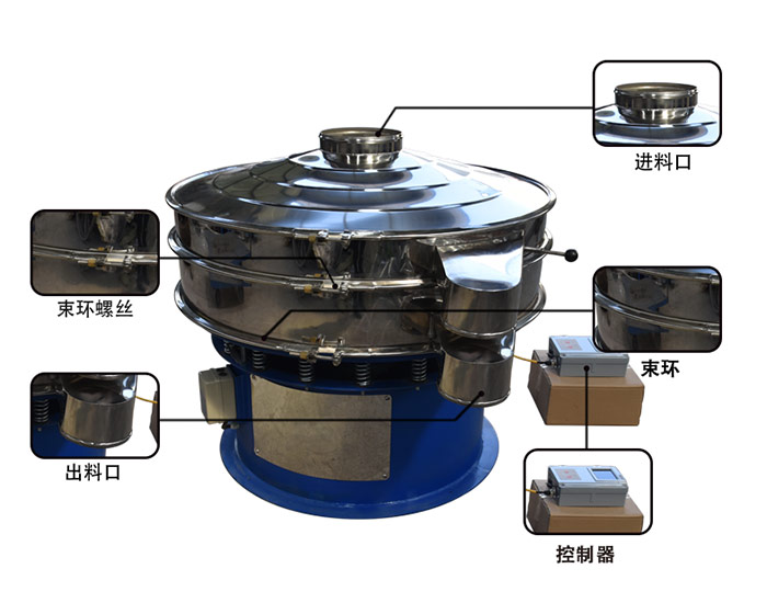 旋振篩(三次元振動篩)主要由進料口、防塵蓋、出料口、束環(huán)、篩網(wǎng)、配重塊、上部重錘、振動體、振動電機、彈簧、下部重錘、機座等部分組成。